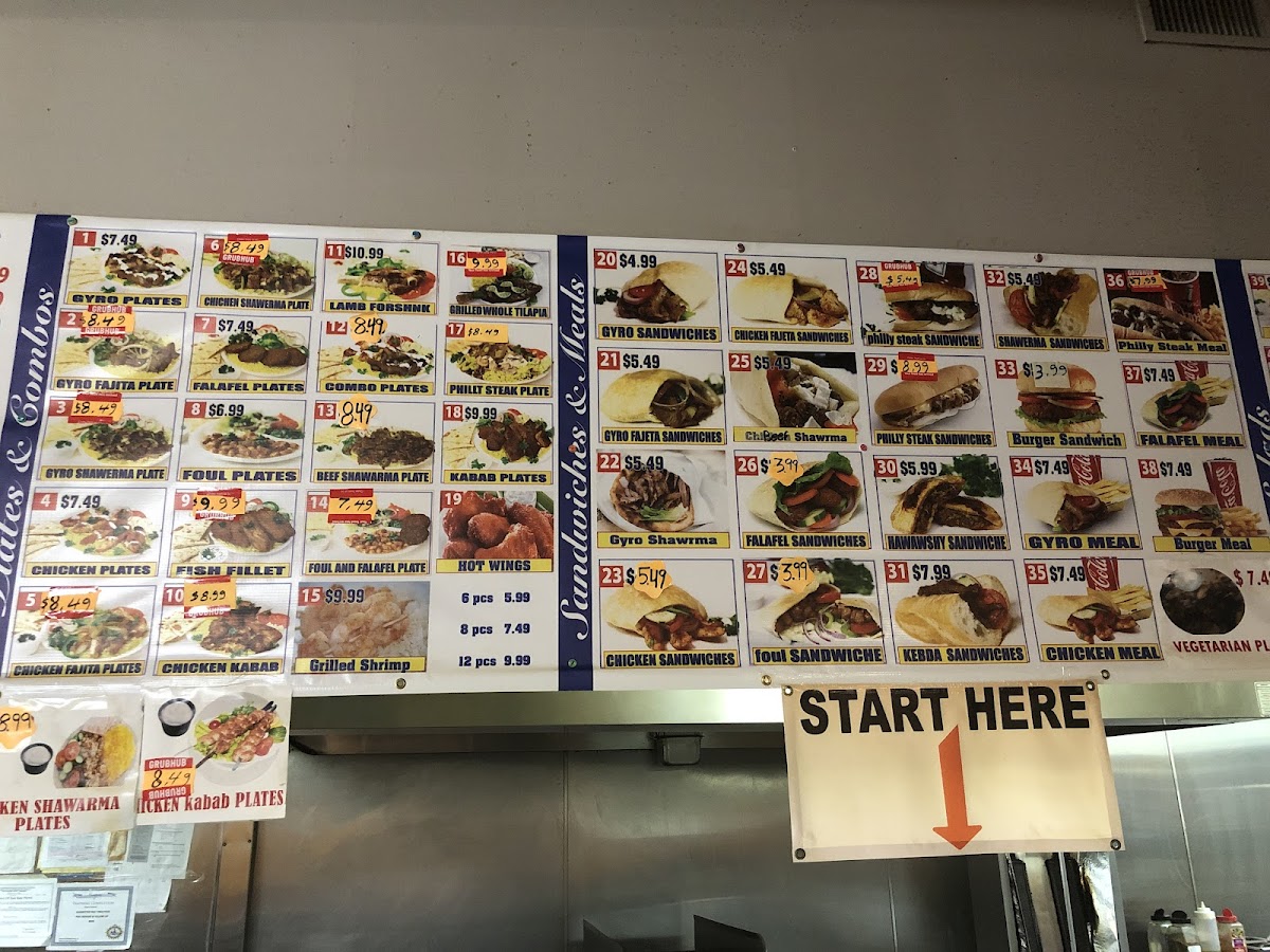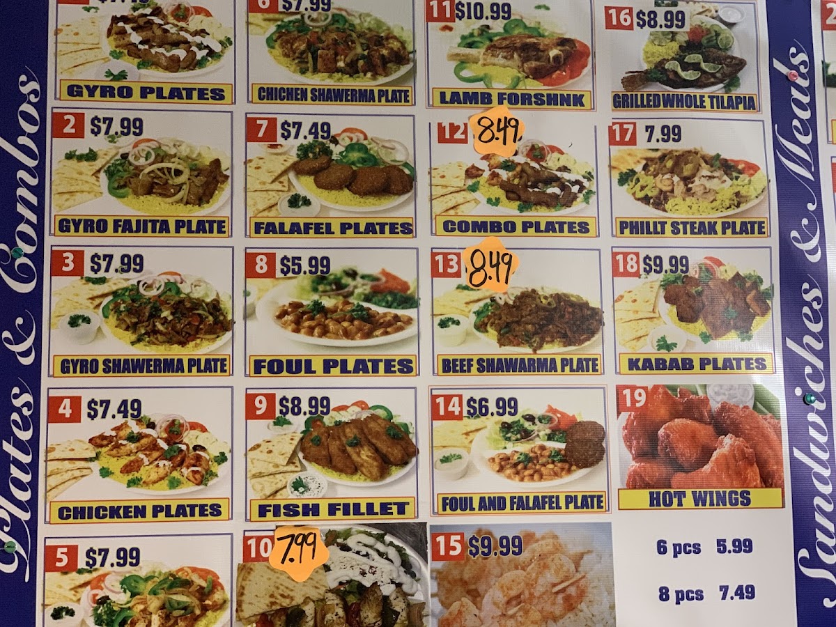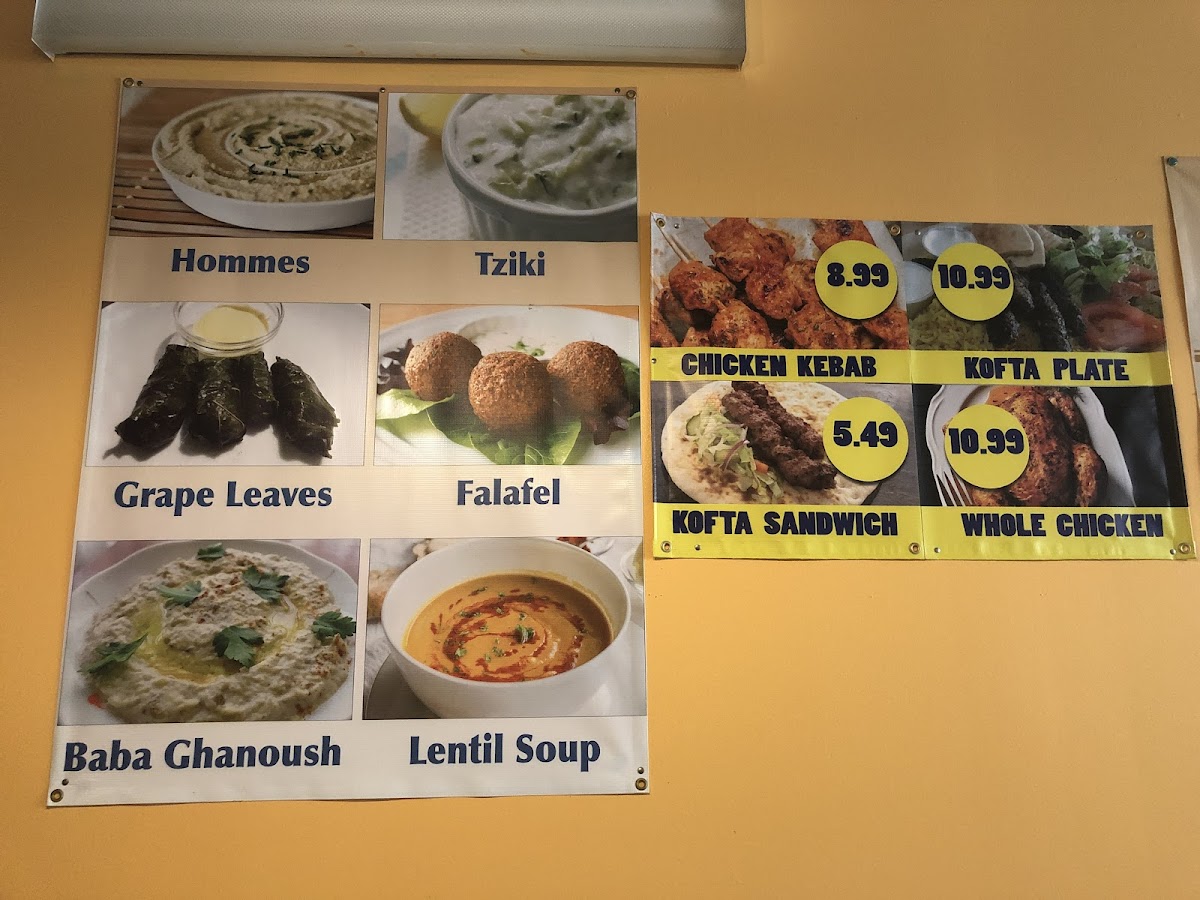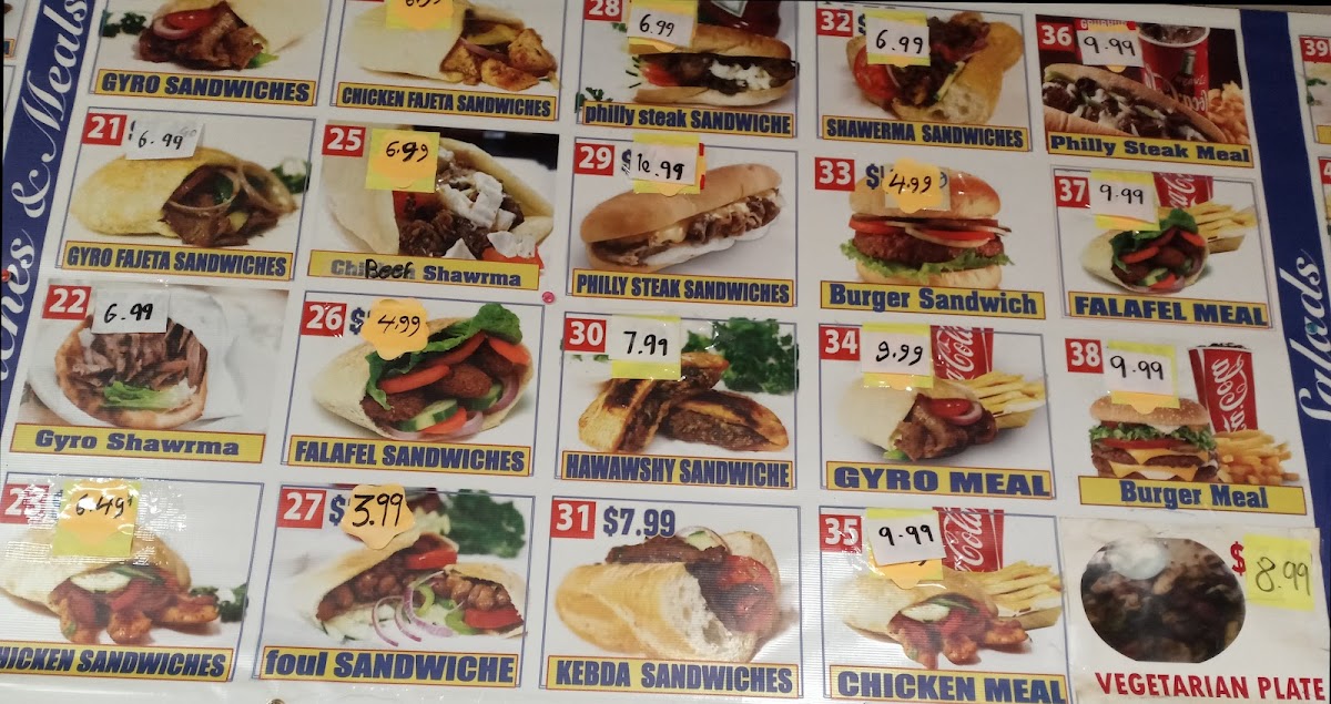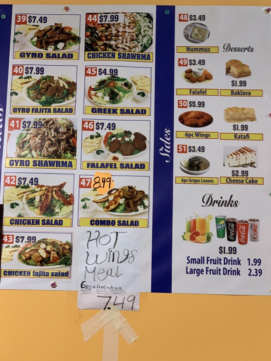 Gyro, chicken, lettuce, tomatoes, onions, cheese, green peppers, and tabouli.